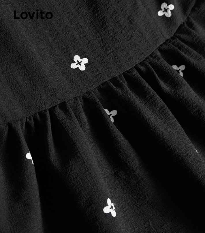 Lovito Casual Floral Puff Sleeves Squared Neck Dress for Women LNE05105 (Black)