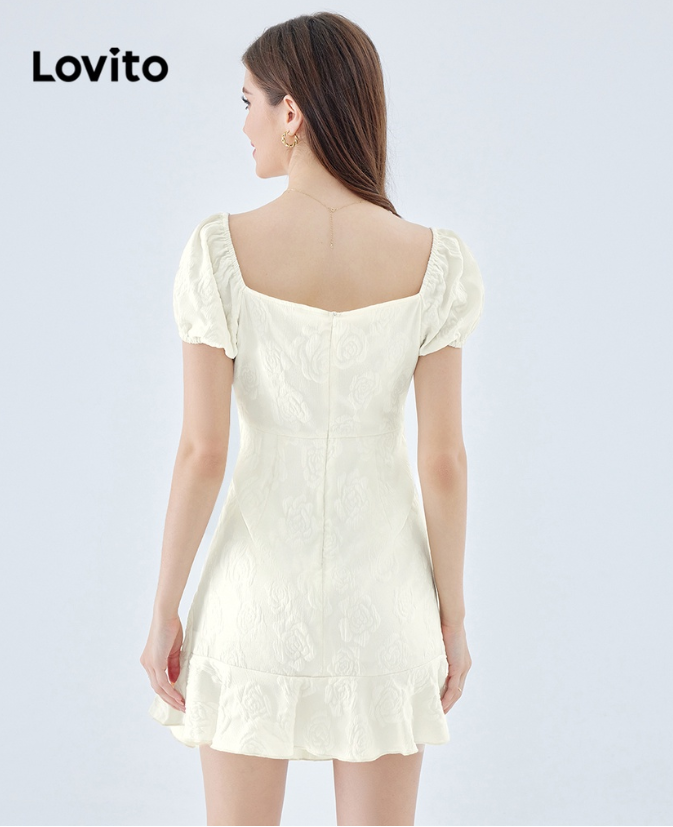 Lovito Casual Plain Ruched Ruffle Hem Puff Sleeve Dress for Women L49ED092 (Apricot)